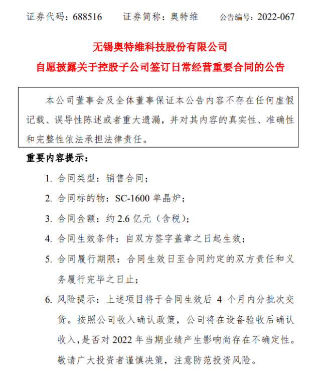 近日,奧特維發(fā)布公告稱,公司控股子公司無錫松瓷機(jī)電有限公司(以下簡(jiǎn)稱“松瓷機(jī)電”)近日與天合光能(青海)晶硅有限公司簽訂《采購(gòu)合同》,松瓷機(jī)電向天合光能(青海)晶硅有限公司銷售SC-1600單晶爐,合同金額約2.6億元(含稅)。