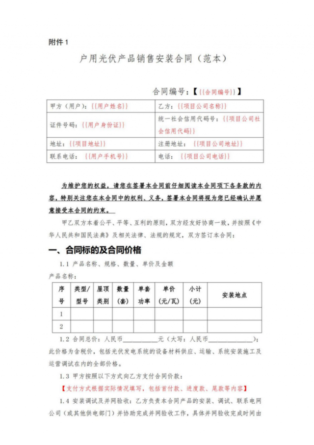 8月30日, 國家能源局轉(zhuǎn)發(fā)了此前中國光伏行業(yè)協(xié)會(huì)在充分征求各方面意見基礎(chǔ)上,編制發(fā)布的《戶用光伏產(chǎn)品銷售安裝合同(范本)》和《戶用光伏電站合作開發(fā)合同(范本)》,供居民用戶和光伏開發(fā)企業(yè)、戶用光伏經(jīng)銷商等各方參考。