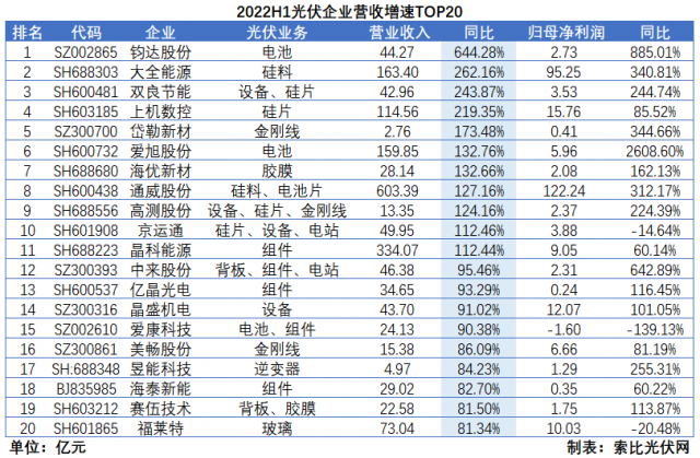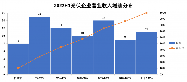 2022年上半年,79家光伏企業(yè)合計創(chuàng)收5571億元,平均增速(“平均”指“中位數(shù)”,下同)達到48%。令人欣喜的是,營收負(fù)增長的企業(yè)占比僅為10%,而營收增速超過40%的企業(yè)占比則高達71%。其中,除了硅料企業(yè)繼續(xù)保持高速增長以外,眾多“跨界者”也乘著光伏行業(yè)的“東風(fēng)”,迎來暴發(fā)式增長。