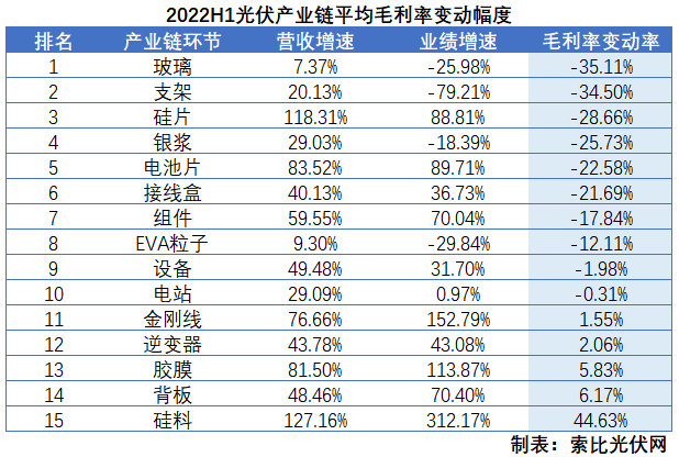 結(jié)合產(chǎn)業(yè)鏈來看,玻璃環(huán)節(jié)隨著去年一季度末新增產(chǎn)能的投產(chǎn),產(chǎn)品價格相較于去年同期大幅下滑,導(dǎo)致毛利率平均降幅高達35.11%。PV Infolink數(shù)據(jù)顯示,2022年上半年光伏玻璃3.2mm鍍膜和2.0mm鍍膜平均價格較去年同期分別下滑18%和23%。