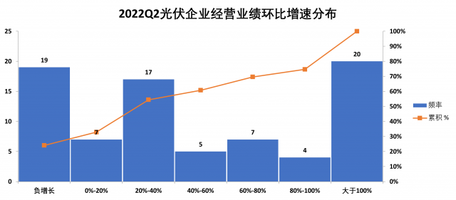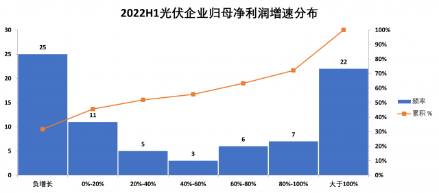 相比于營收的普漲態(tài)勢,光伏企業(yè)的經(jīng)營業(yè)績卻出現(xiàn)顯著分化。2022年上半年,79家光伏企業(yè)的歸母凈利潤總額達到650億元,平均增速為32%。其中,利潤負(fù)增長的企業(yè)占比高達32%,而業(yè)績翻倍增長的企業(yè)占比亦達到28%,呈現(xiàn)顯著的“兩極分化”態(tài)勢。不過,與2021年不同的是,產(chǎn)業(yè)鏈中游的諸多專業(yè)化廠商紛紛迎來“困境反轉(zhuǎn)”,而業(yè)績出現(xiàn)下滑的企業(yè)多為競爭力一般的中小市值企業(yè)。