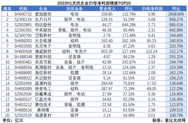 利潤增速方面,除了硅料企業(yè)延續(xù)高增長以外,去年因硅料價格暴漲而出現(xiàn)虧損的產(chǎn)業(yè)鏈中游專業(yè)化廠商,2022年上半年受益于供應(yīng)鏈管理能力的提升以及產(chǎn)品結(jié)構(gòu)的優(yōu)化,紛紛迎來困境翻轉(zhuǎn),其中愛旭股份、東方日升、中來股份的利潤增速分別達到2609%、958%和643%。此外,岱勒新材、東尼電子兩大金剛線廠商受益于硅片環(huán)節(jié)的擴產(chǎn)以及細(xì)線化發(fā)展趨勢,疊加自身的產(chǎn)能擴張和成本下降,利潤增速均超300%。