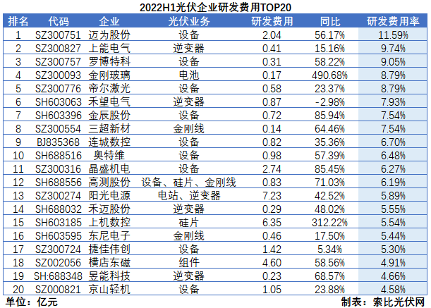 當(dāng)然,N型電池技術(shù)之所以能夠不斷取得突破性進展,離不開生產(chǎn)設(shè)備的持續(xù)升級與迭代。在研發(fā)費用率排名中,前20位中有10家是設(shè)備廠商,其中HJT設(shè)備龍頭邁為股份的研發(fā)費用率更是高達11.59%。在近期的中報業(yè)績交流會中,邁為股份表示預(yù)計今年下半年HJT組件成本能夠與PERC組件持平,至2023年HJT電池片成本優(yōu)勢將會逐步顯現(xiàn)。