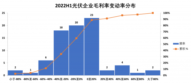雖然2022年上半年光伏行業(yè)依然延續(xù)了高速增長態(tài)勢,多數(shù)光伏企業(yè)也取得了不錯的經(jīng)營業(yè)績,但受到原材料價格大幅上漲、供需關(guān)系變化以及市場競爭加劇等因素的影響,多數(shù)光伏企業(yè)的毛利率相比于去年同期均出現(xiàn)了不同程度的下滑。根據(jù)索比光伏網(wǎng)的統(tǒng)計,79家光伏企業(yè)的毛利率平均降幅達到8.94%,而降幅超過20%的企業(yè)占比更是高達34%。