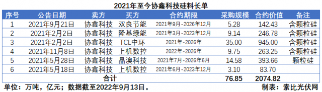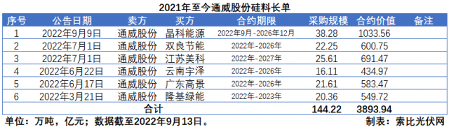 根據(jù)索比光伏網(wǎng)的不完全統(tǒng)計(jì),2021年至今共出現(xiàn)24筆硅料長(zhǎng)單,規(guī)模合計(jì)356.56萬(wàn)噸,價(jià)值9627.15億元(稅后,硅料價(jià)格統(tǒng)一為30.51萬(wàn)元/噸,下同),合約期限普遍在五年左右。其中,硅料三巨頭通威股份、協(xié)鑫科技、新特能源合計(jì)拿下了90.7%的長(zhǎng)單。