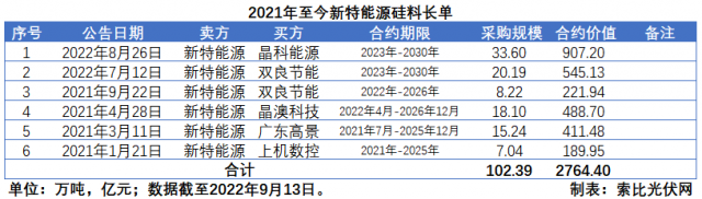 新特能源長(zhǎng)單規(guī)模達(dá)到102.39萬(wàn)噸,合約價(jià)值2764.40億元,主要客戶有晶科能源、晶澳科技、上機(jī)數(shù)控、雙良節(jié)能等。值得注意的是,公司分別與晶科能源和雙良節(jié)能簽下了持續(xù)至2030年的8年長(zhǎng)約,僅次于10多年前無(wú)錫尚德等組件龍頭簽下的10年長(zhǎng)約。