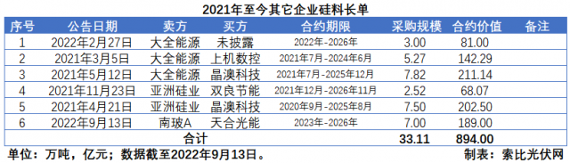 除了硅料三巨頭以外,大全能源、亞洲硅業(yè)兩大老牌硅料廠商分別取得了規(guī)模達(dá)到16.09萬(wàn)噸和10.02萬(wàn)噸、合約價(jià)值434.43億元和270.57億元的長(zhǎng)單。而就在昨天,南玻集團(tuán)宣布與天合光能達(dá)成價(jià)值212.10億元的4年7萬(wàn)噸長(zhǎng)約。