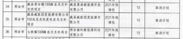 根據(jù)文件來看,相比此前發(fā)布的《風(fēng)電、光伏發(fā)電項(xiàng)目擬調(diào)整情況公示》來看,光伏新增取消三個(gè)2021年光伏保障性項(xiàng)目指標(biāo),規(guī)模總計(jì)為350MW,風(fēng)電則未發(fā)生變化。需要注意的是,三個(gè)光伏項(xiàng)目均為農(nóng)光互補(bǔ)類項(xiàng)目,其業(yè)主分別為惠尚新能源開發(fā)、威縣威能國發(fā)能源以及中國電建。