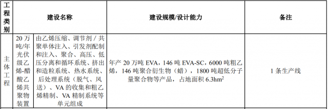建設(shè)進(jìn)度:公用工程及輔助設(shè)施項目計劃建成時間 2024 年 3 月、20 萬噸/年光伏級乙烯-醋酸乙烯共聚物項目計劃建成時間 2024 年 10 月。