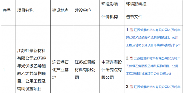 9月16日,江蘇虹景新材料有限公司(以下簡稱” 虹景公司”)20萬噸年光伏級乙烯醋酸乙烯共聚物項目、公用工程及輔助設(shè)施項目進(jìn)行環(huán)評報告書受理公示。根據(jù)企查查顯示,虹景公司為東方盛虹旗下斯?fàn)柊钍Y控股子公司。