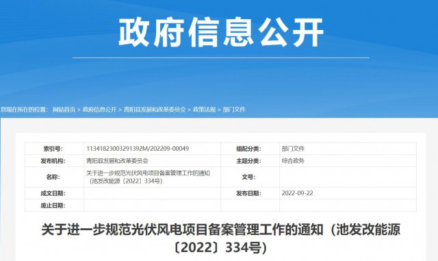 9月22日,安徽青陽縣發(fā)改委官網(wǎng)公布《關(guān)于進(jìn)一步規(guī)范光伏風(fēng)電項(xiàng)目備案管理工作的通知》。