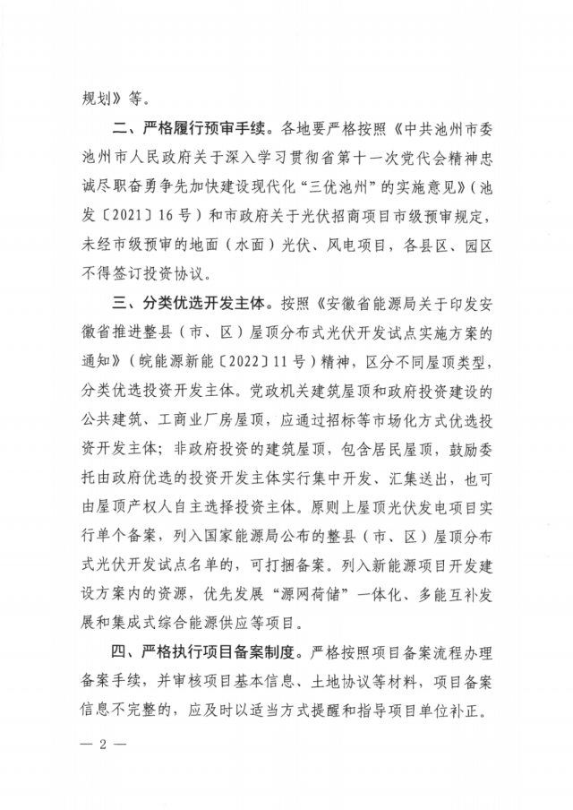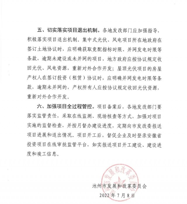 通知強(qiáng)調(diào):各地要嚴(yán)格按照《中共池州市委池州市人民政府關(guān)于深入學(xué)習(xí)貫徹省第十一次黨代會(huì)精神忠誠盡職奮勇爭(zhēng)先加快建設(shè)現(xiàn)代化“三優(yōu)池州”的實(shí)施意見》(池發(fā)(2021] 16號(hào))和市政府關(guān)于光伏招商項(xiàng)目市級(jí)預(yù)審規(guī)定,未經(jīng)市級(jí)預(yù)審的地面(水面)光伏、風(fēng)電項(xiàng)目,各縣區(qū)、園區(qū)不得簽訂投資協(xié)議。