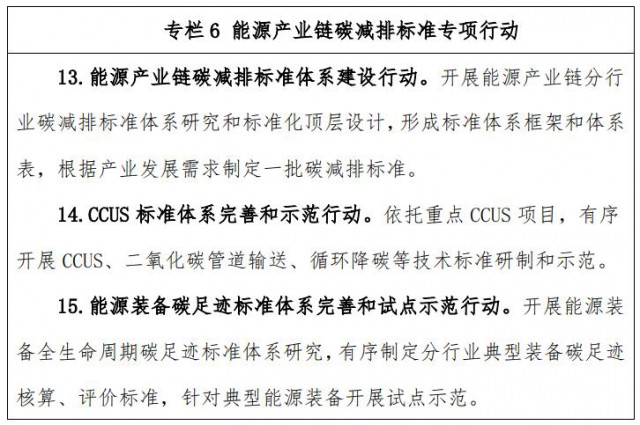 圍繞能源領(lǐng)域二氧化碳捕集利用與封存(CCUS)有關(guān)技術(shù)研發(fā)和項目建設(shè)需求,加快推進相關(guān)標準管理體系和標準體系完善,推進二氧化碳捕集、輸送、封存監(jiān)測、泄漏預警、驅(qū)油等關(guān)鍵環(huán)節(jié)標準制修訂。