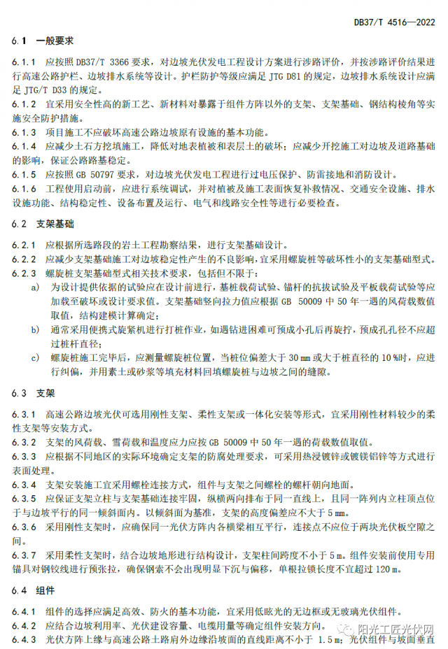 本標(biāo)準(zhǔn)綜合考慮了高速公路行車(chē)對(duì)邊坡光伏的技術(shù)要求,具有安全、環(huán)保、美觀、經(jīng)濟(jì)的技術(shù)特點(diǎn)。在安全性上,精心選用了低反光無(wú)眩光、防火防水防腐、不易碎、具有自清潔功能的輕質(zhì)柔性光伏組件和帶有自動(dòng)關(guān)斷功能的逆變器,采用柔性支架安裝,組件棱角使用柔性材料包裹,避免影響駕駛安全和二次事故傷害。在環(huán)保性上,設(shè)計(jì)了螺旋樁打孔施工技術(shù),減少對(duì)邊坡草皮的破壞。在美觀性上,注重光伏組件陣列與邊坡斜面外觀上的統(tǒng)一融合,視覺(jué)效果美觀、舒適。在經(jīng)濟(jì)性上,最大限度提高邊坡資源利用率,有利于規(guī)?;_(kāi)發(fā)。