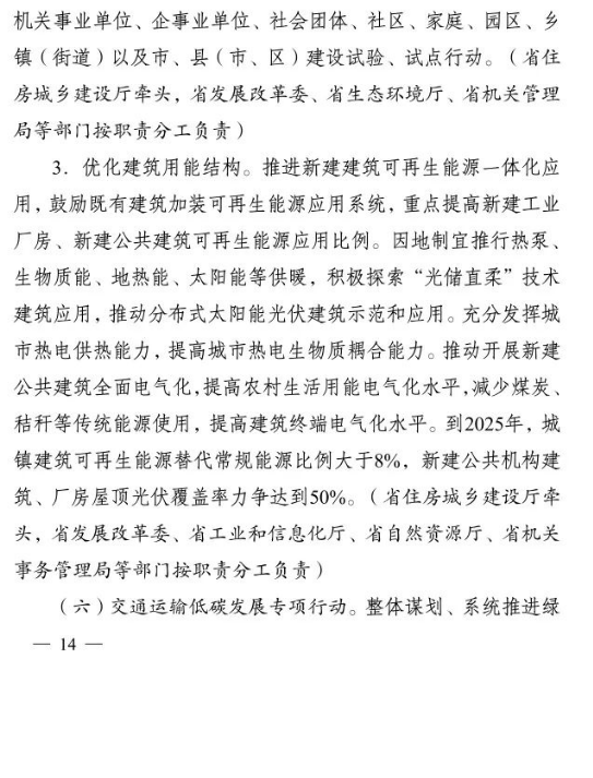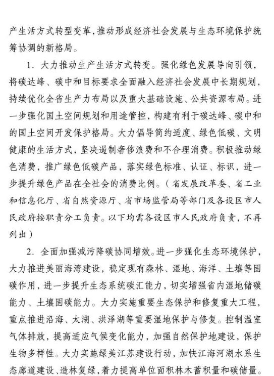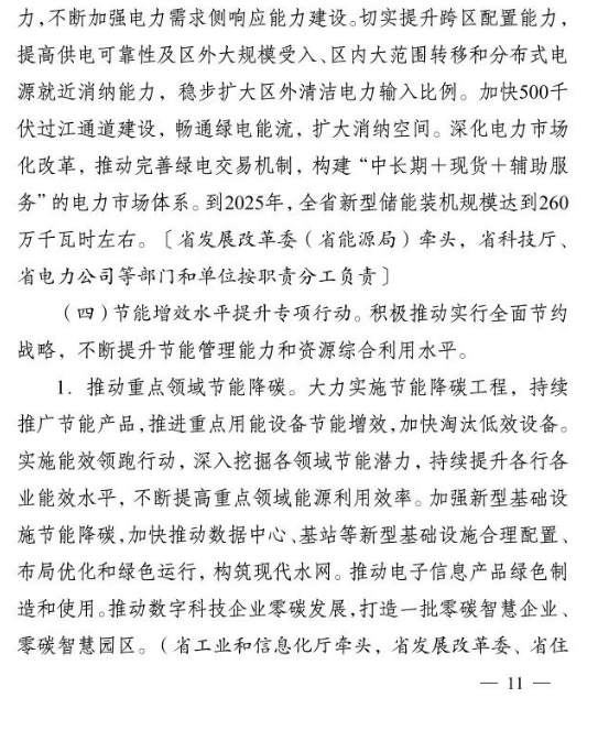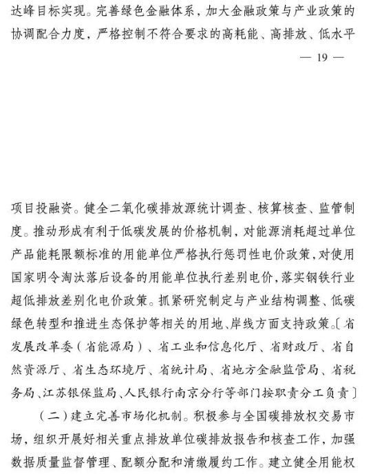 10月2日,江蘇省人民政府印發(fā)《江蘇省碳達峰實施方案》。文件提出,大力發(fā)展非化石能源。積極增加可再生能源消費,落實國家下達的可再生能源電力消納責(zé)任權(quán)重,新增跨省跨區(qū)通道可再生能源電量比例不低于50%.光伏方面,堅持集中式和分布式并重,穩(wěn)步有序開展海上光伏建設(shè),加快推進光伏復(fù)合利用,全力發(fā)展分布式光伏系統(tǒng),開展整縣(市、區(qū))屋頂分布式光伏開發(fā)試點。到2025年,全省光伏發(fā)電裝機達到3500萬千瓦以上。風(fēng)電方面,優(yōu)化風(fēng)電發(fā)展結(jié)構(gòu),全力推進近海海上風(fēng)電規(guī)?;l(fā)展,穩(wěn)妥開展深遠海風(fēng)電示范建設(shè)。推動風(fēng)電裝備制造業(yè)規(guī)?;?、集聚化、高端化發(fā)展,加強關(guān)鍵核心部件研發(fā)。到2025年,全省風(fēng)電裝機達到2800萬千瓦以上。核電方面,在確保絕對安全的前提下安全有序發(fā)展核電,加快規(guī)劃建設(shè)連云港千萬千瓦級核電基地,加強核電關(guān)鍵技術(shù)、核電裝備研發(fā)和核能多元化綜合利用,積極穩(wěn)妥推進綠色核能供熱示范項目,研究制訂核能利用支持政策。其他方面,因地制宜規(guī)劃發(fā)展生物質(zhì)能,積極推進沼氣發(fā)電項目建設(shè),統(tǒng)籌布局垃圾焚燒電站項目。因地制宜加強水能利用,科學(xué)推進抽水蓄能開發(fā)。大力推進光熱能、地?zé)崮?、空氣熱能等可再生能源的非電化利用,加快推動氫能研究與推廣應(yīng)用。力爭到2025年底全省生物質(zhì)發(fā)電裝機規(guī)模達到300萬千瓦。