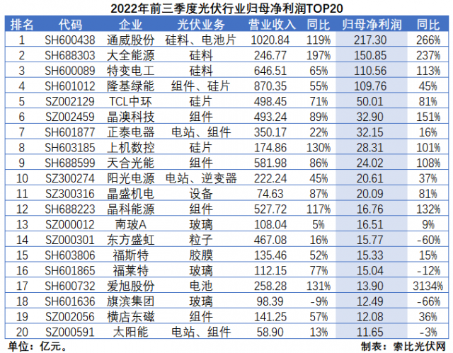 從營(yíng)收規(guī)模來(lái)看,硅料和組件依然是創(chuàng)收能力最強(qiáng)的環(huán)節(jié)。而且,多數(shù)企業(yè)前三季度營(yíng)業(yè)收入均已超過(guò)2021年全年,且創(chuàng)歷史新高。其中,通威股份營(yíng)收規(guī)模首次突破千億大關(guān),達(dá)到1021億元;隆基綠能二、三季度邊際改善顯著,環(huán)比增速分別達(dá)到71%和15%,營(yíng)收規(guī)模達(dá)到870.35億元;特變電工受益于硅料、煤炭產(chǎn)品的“量?jī)r(jià)齊升”,達(dá)到646.51億元。