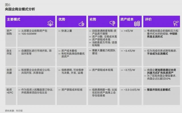 央國(guó)企更多考慮如何能更快速持有優(yōu)質(zhì)資產(chǎn),資產(chǎn)收購(gòu)仍舊會(huì)是中短期的主流模式(如圖 6)??紤]到央國(guó)企的指標(biāo)壓力和集中式光伏的經(jīng)驗(yàn),通過(guò)從民營(yíng)企業(yè)收購(gòu)資產(chǎn)包能夠幫助其實(shí)現(xiàn)快速上量。但同時(shí)該模式存在諸多劣勢(shì):例如資產(chǎn)分散且品質(zhì)不理想、資產(chǎn)獲取成本高、信息透明度有限、賣(mài)方話(huà)語(yǔ)權(quán)過(guò)高等問(wèn)題。為完成國(guó)家任務(wù)指標(biāo),近年來(lái)央國(guó)企也試探性推進(jìn)資產(chǎn)成本更低的自建團(tuán)隊(duì)開(kāi)發(fā)模式,但由于需要大量能力與團(tuán)隊(duì)建設(shè),自主開(kāi)發(fā)暫不會(huì)不會(huì)成為主流模式。