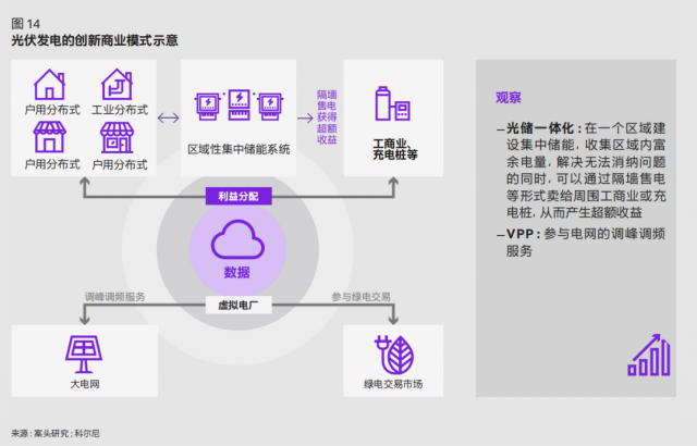 一邊是消納困局、一邊是電價(jià)短期波動(dòng)風(fēng)險(xiǎn),戶(hù)用光伏發(fā)電正經(jīng)歷著來(lái)自市場(chǎng)的新考驗(yàn)。結(jié)合光伏發(fā)電商業(yè)模式判斷,未來(lái)光儲(chǔ)一體化和虛擬電網(wǎng)兩種創(chuàng)新模式的發(fā)展或成為針對(duì)上述挑戰(zhàn)的最優(yōu)解法(如圖 14)。