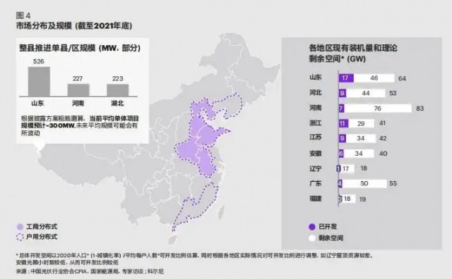 綜合考慮市場(chǎng)空間、綜合條件、產(chǎn)權(quán)模式等因素,科爾尼認(rèn)為山東、河北、河南、浙江、江蘇、安徽、遼寧、廣東與福建為未來(lái)整縣推進(jìn)領(lǐng)域的九大高潛力市場(chǎng)。其中,山東、河北、河南地區(qū)雖競(jìng)爭(zhēng)激烈,但可開(kāi)發(fā)空間仍十分可觀(guān);浙江、江蘇由于居民投資意識(shí)強(qiáng),整體出售市場(chǎng)更具吸引力;安徽、遼寧、廣東、福建綜合條件優(yōu)勢(shì)明顯,建議重點(diǎn)布局。根據(jù)測(cè)算,當(dāng)前整縣推進(jìn)的平均單體項(xiàng)目規(guī)模預(yù)計(jì)在300MW 左右(如圖 4)。