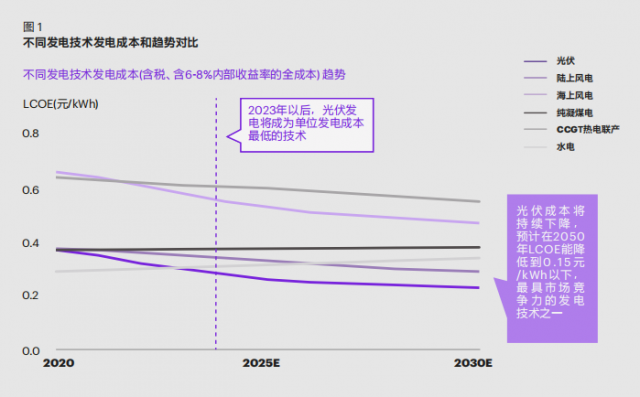 能源結(jié)構(gòu)調(diào)整無(wú)疑是能源戰(zhàn)略中最重要的一環(huán)。在眾多新能源發(fā)展路線(xiàn)中,光伏是最優(yōu)質(zhì)的選項(xiàng)之一,光伏發(fā)電技術(shù)成本優(yōu)勢(shì)突出。科爾尼預(yù)測(cè),到 2023 年后,光伏發(fā)電的平準(zhǔn)化度電成本(LCOE)將在所有發(fā)電技術(shù)中達(dá)到最低,并預(yù)計(jì)在 2050 年進(jìn)一步下降至 0.15 元 /kWh(如圖 1)。成本優(yōu)勢(shì)下,光伏有潛力成為未來(lái)中長(zhǎng)期發(fā)展最快的細(xì)分賽道。