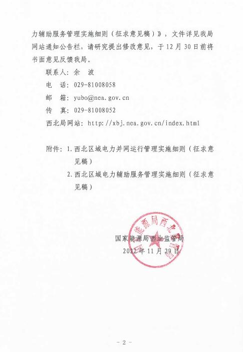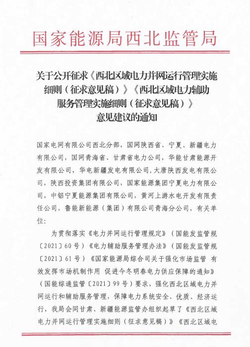 12月1日,國家能源局西北監(jiān)管局公開征求《西北區(qū)域電力并網(wǎng)運行管理實施細則(征求意見稿)》《西北區(qū)域電力輔助服務(wù)管理實施細則(征求意見稿)》意見建議的通知。