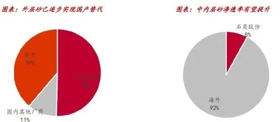 光伏石英坩堝產(chǎn)品端:光伏行業(yè)由于產(chǎn)品精密度程度高、技術(shù)發(fā)展快,對石英坩堝的純度、精度要求日益嚴(yán)格。我國的石英制品行業(yè)起步較晚,只有少數(shù)規(guī)?;髽I(yè)的石英坩堝技術(shù)方面達(dá)到先進(jìn)水平。技術(shù)上來看,近幾年我國石英制品行業(yè)的技術(shù)進(jìn)步較為明顯,尤其是石英坩堝技術(shù)水平與國外企業(yè)產(chǎn)品的差距逐步縮小,在坩堝尺寸、純度、拉晶時間和拉晶次數(shù)等方面均取得顯著進(jìn)步。此外,國內(nèi)石英坩堝具有一定的成本優(yōu)勢,在質(zhì)量和性能等方面與進(jìn)口石英坩堝的差距正逐漸縮小。這些都為國產(chǎn)化創(chuàng)造了條件。從細(xì)分部件來看,外層砂已基本實(shí)現(xiàn)國產(chǎn)替代,中內(nèi)層砂產(chǎn)品和客戶認(rèn)可度逐步提升。目前石英股份的高純石英砂仍以外層砂為主,我們預(yù)計石英股份在中內(nèi)層砂質(zhì)量以及客戶認(rèn)可度上均有提升,并有望逐步提高中內(nèi)層砂的滲透率。我們預(yù)計21年石英股份外層砂份額約50%,中內(nèi)層砂份額約8%。