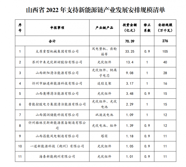 根據(jù)《山西省支持新能源產(chǎn)業(yè)發(fā)展2022年工作方案》精神,在各市和相關(guān)企業(yè)申報的基礎(chǔ)上,省能源局委托省投資咨詢和發(fā)展規(guī)劃院組織了2022年支持新能源產(chǎn)業(yè)發(fā)展風(fēng)電光伏發(fā)電建設(shè)規(guī)模評審,評審確定了17家企業(yè)符合安排標準,擬安排風(fēng)電光伏建設(shè)規(guī)模372萬千瓦,納入年度建設(shè)計劃。其中:新能源產(chǎn)業(yè)鏈企業(yè)11個家,安排規(guī)模276萬千瓦;煤電調(diào)峰能力建設(shè)企業(yè)6家,安排96萬千瓦。