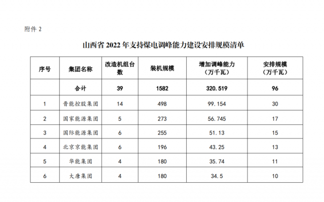 在煤電調(diào)峰安排清單中,主要企業(yè)為晉能、國家能源集團、山西國際、京能、華能、大唐等6家央國企,增加調(diào)峰能力3.2GW,安排新能源規(guī)模0.96GW。