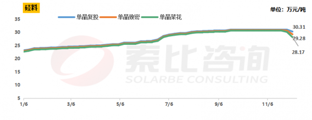 硅料價(jià)格連續(xù)兩周下跌,上周單晶復(fù)投均價(jià)30.31萬(wàn)元/噸,單晶致密均價(jià)29.28萬(wàn)元/噸,單晶菜花均價(jià)28.17萬(wàn)元/噸。