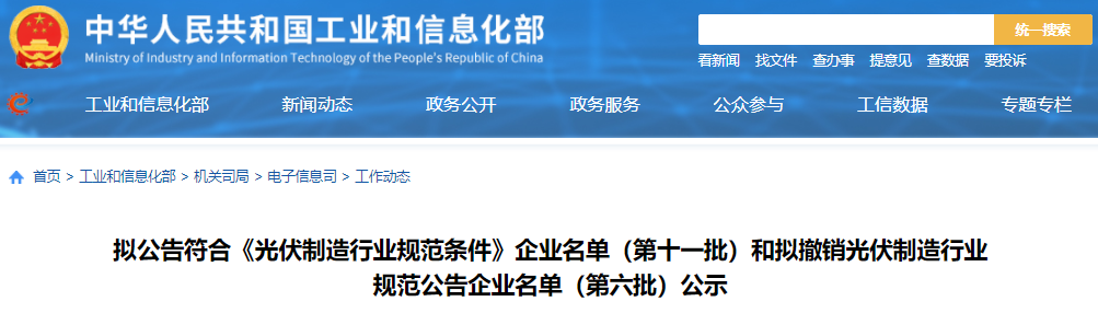 擬公告符合《光伏制造行業(yè)規(guī)范條件》企業(yè)名單(第十一批)和擬撤銷光伏制造行業(yè)規(guī)范公告企業(yè)名單(第六批)公示