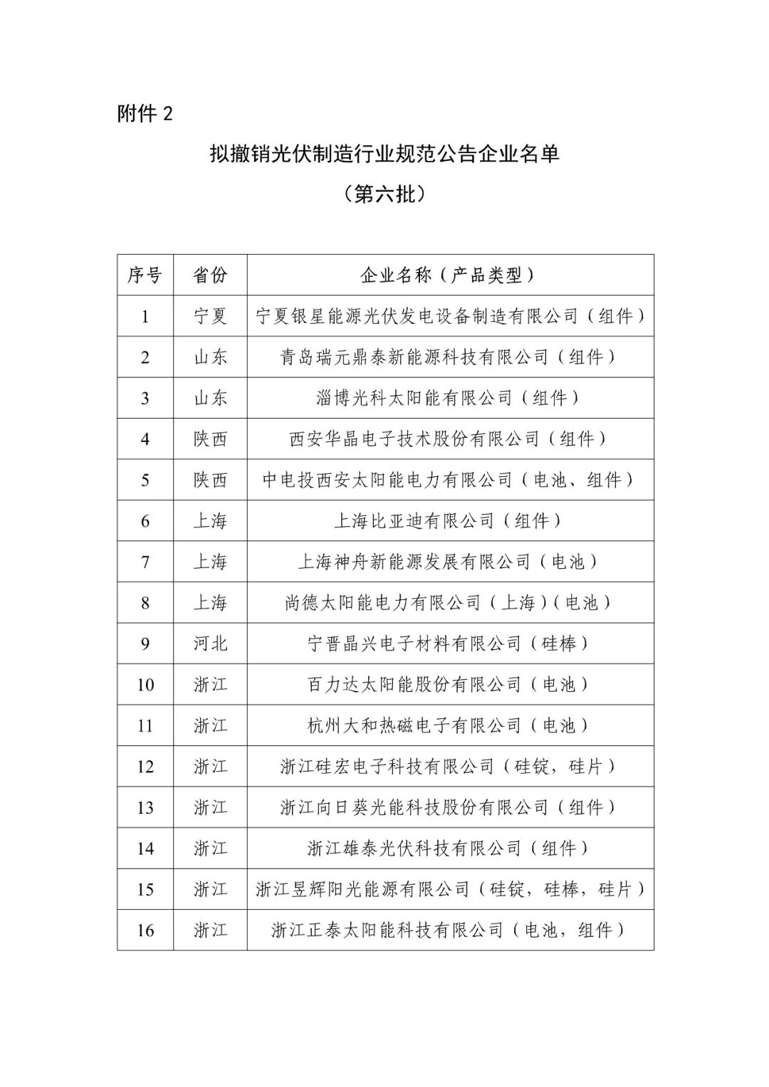 寧夏銀星能源光伏發(fā)電設(shè)備制造有限公司等16家已公告企業(yè),因不能保持規(guī)范條件要求,擬撤銷其規(guī)范條件企業(yè)名單,一并予以公示(見附件2)。