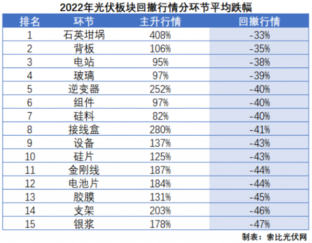 回撤行情中,石英坩堝、背板、電站平均回撤最小,分別為33%、35%和38%,而銀漿、支架、膠膜回撤幅度最大,分別達(dá)到47%、46%和45%。