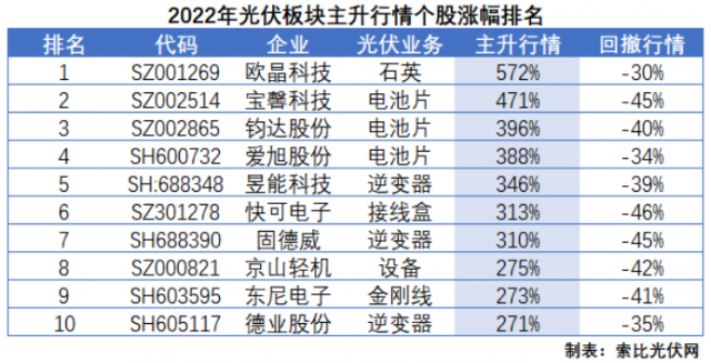 個股方面,次新、電池片以及逆變器漲幅居前。其中,年內(nèi)上市的“石英坩堝第一股”歐晶科技、微逆龍頭昱能科技、接線盒翹楚快可電子漲幅分別達(dá)到572%、346%和313%;跨界HJT和TOPCon的寶馨科技和鈞達(dá)股份漲幅分別達(dá)到471%和396%,主打ABC電池技術(shù)路線的愛旭股份漲幅達(dá)到388%;光儲逆變器頭部廠商固德威和德業(yè)股份漲幅分別達(dá)到310%和271%。