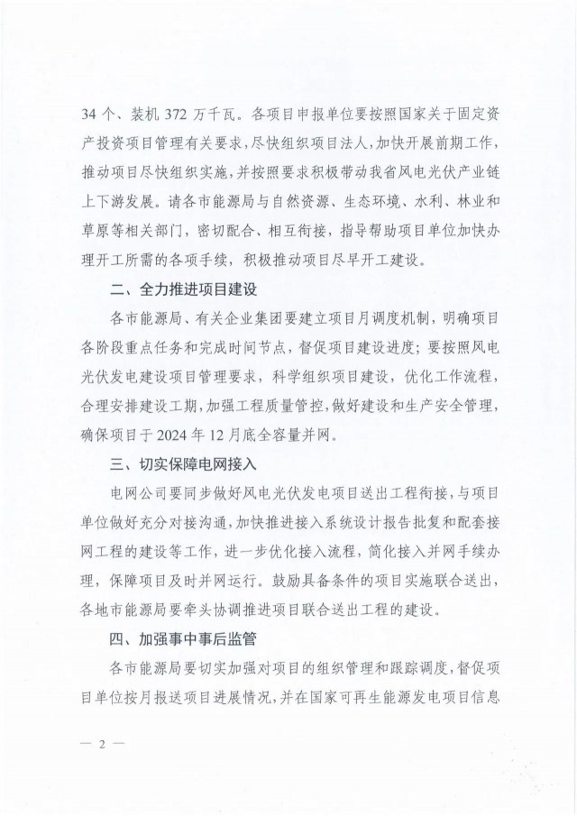 支持新能源產(chǎn)業(yè)發(fā)展項(xiàng)目34個,裝機(jī)372萬千瓦(3.72GW)。其中,光伏項(xiàng)目16個,風(fēng)光一體項(xiàng)目1個(含光伏6萬千瓦),涉及光伏項(xiàng)目共197萬千瓦(1.97GW)。要求確保項(xiàng)目于2024年12月底全容量并網(wǎng)。