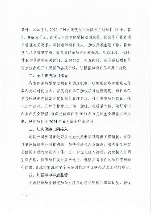 具體看,保障性并網(wǎng)項(xiàng)目98個,裝機(jī)1046萬千瓦(10.46GW)。其中,光伏項(xiàng)目68個,裝機(jī)741萬千瓦(7.41GW),風(fēng)光儲一體項(xiàng)目2個,裝機(jī)共25萬千瓦。要求確保光伏項(xiàng)目于2023年9月底前全容量并網(wǎng)發(fā)電。