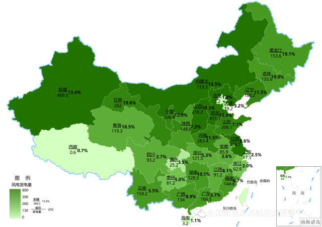 截至9月底累計(jì)風(fēng)電發(fā)電量(億千瓦時(shí))及占本地區(qū)總發(fā)電量比重