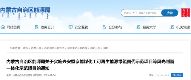 1月4日,內(nèi)蒙古能源局官網(wǎng)發(fā)布“內(nèi)蒙古自治區(qū)能源局關(guān)于實(shí)施興安盟京能煤化工可再生能源綠氫替代示范項(xiàng)目等風(fēng)光制氫一體化示范項(xiàng)目的通知”。