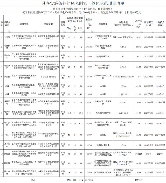 通知顯示:按照《內(nèi)蒙古自治區(qū)人民政府辦公廳關(guān)于促進(jìn)氫能產(chǎn)業(yè)高質(zhì)量發(fā)展的意見》和《內(nèi)蒙古自治區(qū)風(fēng)光制氫一體化示范項(xiàng)目實(shí)施細(xì)則(2022年版)》有關(guān)要求,經(jīng)自治區(qū)人民政府同意,計(jì)劃實(shí)施興安盟京能煤化工可再生能源綠氫替代示范項(xiàng)目等15個(gè)風(fēng)光制氫一體化示范項(xiàng)目。具備實(shí)施條件的項(xiàng)目15個(gè)(4個(gè)離網(wǎng)型,11個(gè)并網(wǎng)型),配套新能源規(guī)模631.2萬千瓦(其中風(fēng)電473.2萬千瓦,光伏158萬千瓦),制氫能力28.2萬噸/年,總投資495.8億元。