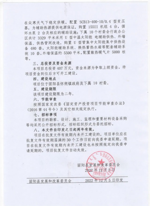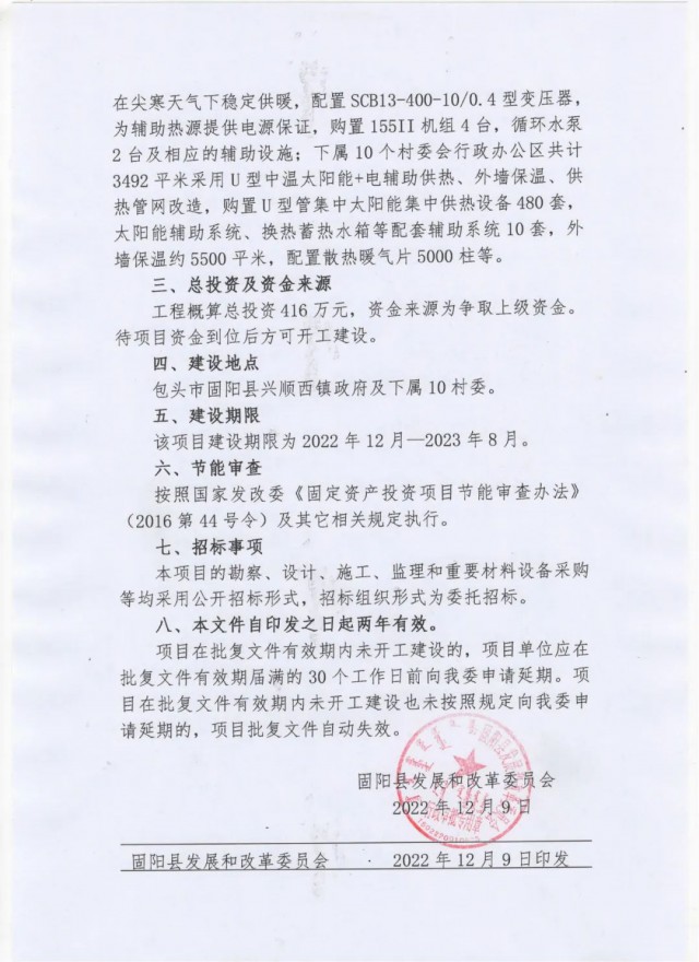 《固陽縣懷朔鎮(zhèn)政府空氣能供熱和村委辦公場所太陽能取暖"零碳排放”節(jié)能改造項目批復(fù)公示》