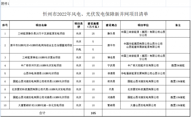 按照山西省能源局《關(guān)于下達(dá)山西省2022年風(fēng)電光伏發(fā)電保障性并網(wǎng)年度建設(shè)計(jì)劃的通知》(晉能源新能源發(fā)〔2022〕428號(hào))和《關(guān)于下達(dá)山西省2022年支持新能源產(chǎn)業(yè)發(fā)展風(fēng)電光伏發(fā)電建設(shè)計(jì)劃的通知》(晉能源新能源發(fā)〔2022〕429號(hào)),2022年度山西省能源局共下達(dá)我市風(fēng)電、光伏發(fā)電項(xiàng)目共27個(gè)326萬(wàn)千瓦,其中下達(dá)2022年度保障性并網(wǎng)項(xiàng)目9個(gè)105萬(wàn)千瓦(詳見附件1),下達(dá)支持新能源產(chǎn)業(yè)發(fā)展風(fēng)電、光伏發(fā)電建設(shè)項(xiàng)目18個(gè)221萬(wàn)千瓦(詳見附件2)。為做好項(xiàng)目建設(shè)有關(guān)工作,現(xiàn)就有關(guān)要求通知如下: