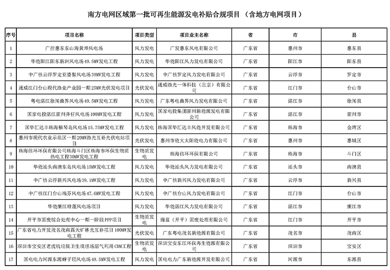 南方電網(wǎng)關于公布第一批可再生能源發(fā)電補貼合規(guī)項目清單的公告
