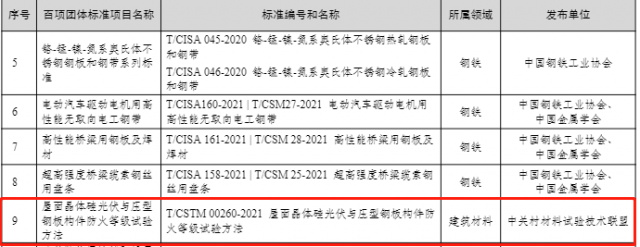 依據(jù)工信部函【2022】272號--工業(yè)和信息化部關于公布2022年團體標準應用示范項目的通告,中關村材料試驗技術聯(lián)盟(CSTM)發(fā)布的標準《屋面晶體硅光伏與壓型鋼板構件防火等級試驗方法》(T/CSTM 00260-2021)入圍2022年團體標準應用示范項目。