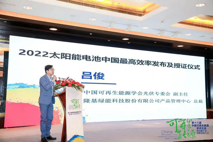 中國(guó)可再生能源學(xué)會(huì)光伏專(zhuān)委會(huì)副主任、隆基綠能產(chǎn)品管理中心總裁呂俊博士進(jìn)行《2022太陽(yáng)電池中國(guó)最高效率》發(fā)布。