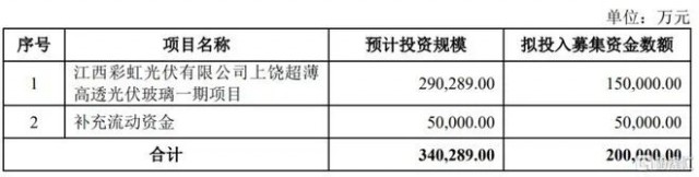 根據(jù)最新招股書(shū)(上會(huì)稿),本次發(fā)行上市,公司擬募資20億元,其中15億元用于投入“江西彩虹光伏有限公司上饒超薄高透光伏玻璃一期項(xiàng)目”、5億元用于“補(bǔ)充流動(dòng)資金”。