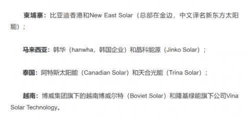 結(jié)果發(fā)現(xiàn)有5家公司試圖規(guī)避關(guān)稅,它們分別是:比亞迪、隆基綠能、阿特斯太陽(yáng)能、天合光能和新東方太陽(yáng)能,其業(yè)務(wù)部門都被認(rèn)定違反了反傾銷和反補(bǔ)貼稅法律,必須支付高額關(guān)稅。而主要的組件供應(yīng)商韓華、晶科、博維等沒(méi)有違反法律。
