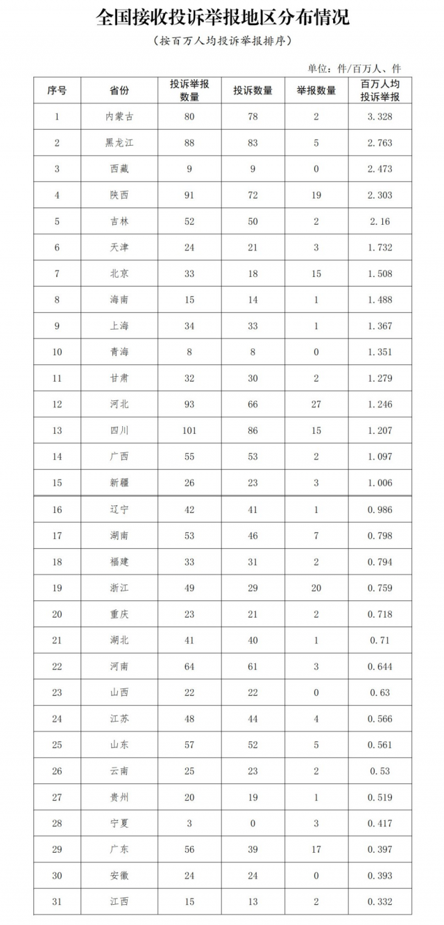 各省(自治區(qū)、直轄市)按照接收投訴舉報(bào)數(shù)量排序,四川、河北、陜西、黑龍江、內(nèi)蒙古排在全國(guó)前5位。其中:按投訴數(shù)量排序,四川、黑龍江、內(nèi)蒙古、陜西、河北排在全國(guó)前5位;按舉報(bào)數(shù)量排序,河北、浙江、陜西、廣東、北京(四川并列)排在全國(guó)前5位;按百萬(wàn)人均投訴舉報(bào)數(shù)量排序,內(nèi)蒙古、黑龍江、西藏、陜西、吉林排在全國(guó)前5位。(全國(guó)接收投訴舉報(bào)地區(qū)分布情況詳見(jiàn)附件1)
