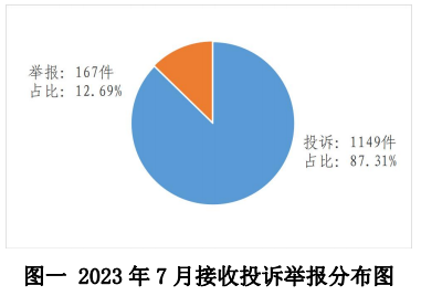 2023年7月,12398熱線共接收投訴舉報(bào)1316件,環(huán)比增長(zhǎng)39.70%、同比下降27.01%。其中:投訴1149件,環(huán)比增長(zhǎng)41.85%、同比下降33.66%;舉報(bào)167件,環(huán)比增長(zhǎng)26.52%、同比增長(zhǎng)135.21%。