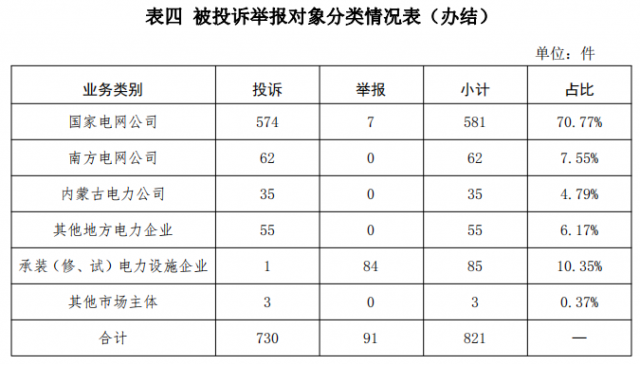 從被投訴舉報(bào)對(duì)象看,供電企業(yè)733件、占投訴舉報(bào)總數(shù)的89.28%,其中國(guó)家電網(wǎng)公司581件、占比70.77%,南方電網(wǎng)公司62件、占比7.55%,內(nèi)蒙古電力公司35件、占比3.65%,其他地方電力企業(yè)55件、占比6.17%;承裝(修、試)電力設(shè)施企業(yè)85件、占比10.35%;其他市場(chǎng)主體3件、占比0.37%。