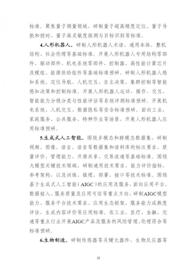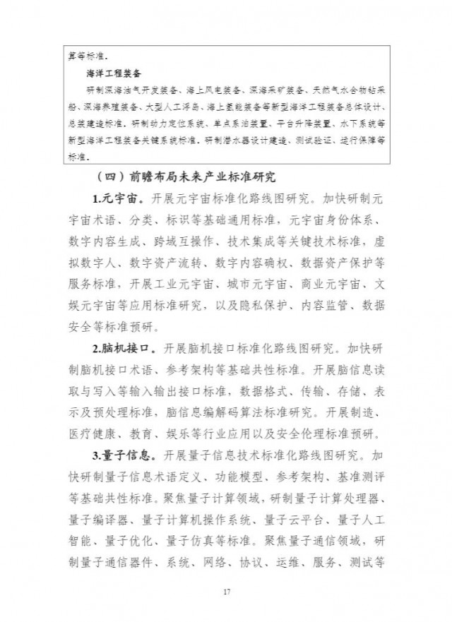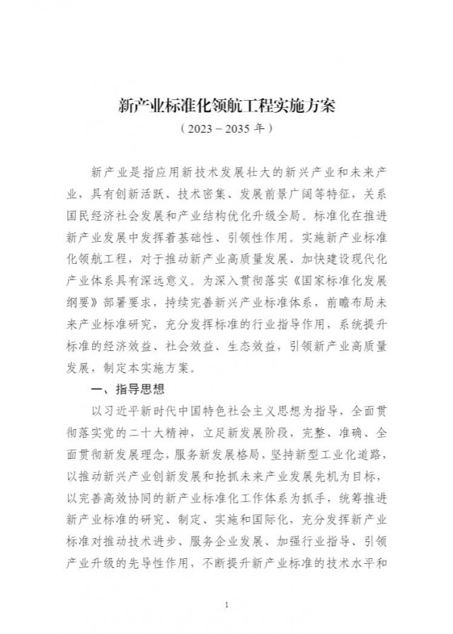 為貫徹落實《國家標(biāo)準(zhǔn)化發(fā)展綱要》,持續(xù)完善新興產(chǎn)業(yè)標(biāo)準(zhǔn)體系建設(shè),前瞻布局未來產(chǎn)業(yè)標(biāo)準(zhǔn)研究,充分發(fā)揮標(biāo)準(zhǔn)的行業(yè)指導(dǎo)作用,引領(lǐng)新產(chǎn)業(yè)高質(zhì)量發(fā)展,工業(yè)和信息化部、科技部、國家能源局、國家標(biāo)準(zhǔn)化管理委員會組織編制了《新產(chǎn)業(yè)標(biāo)準(zhǔn)化領(lǐng)航工程實施方案(2023─2035年)》?,F(xiàn)印發(fā)你們,請結(jié)合本地區(qū)、本行業(yè)實際,抓好貫徹落實。