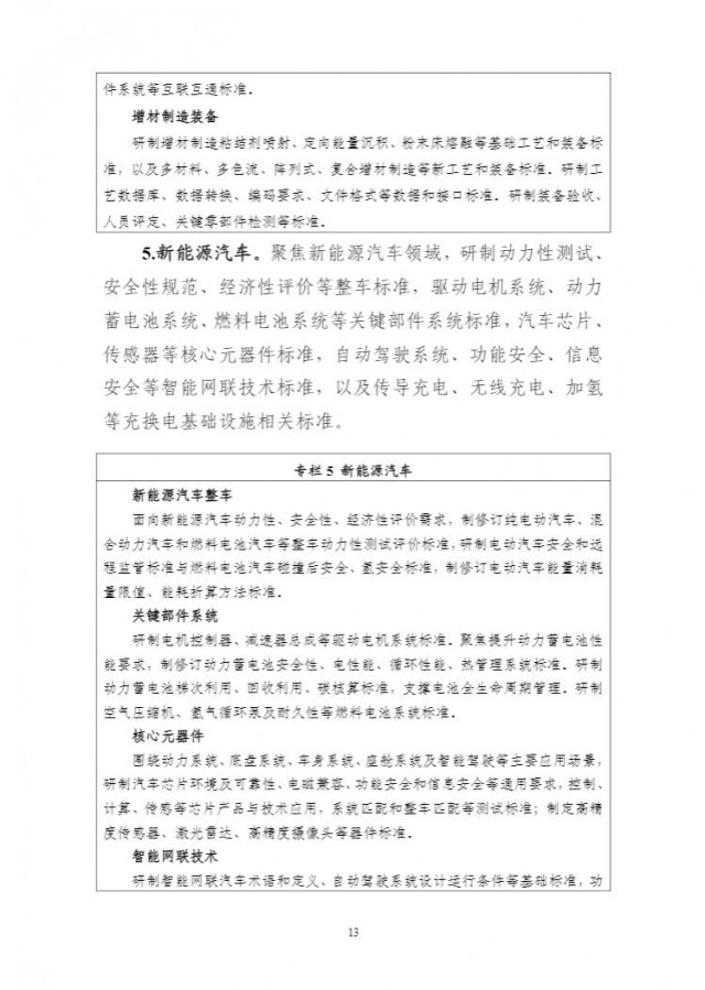 《方案》明確,在新能源汽車方面,聚焦新能源汽車領(lǐng)域,研制動力性測試、安全性規(guī)范、經(jīng)濟(jì)性評價等整車標(biāo)準(zhǔn),驅(qū)動電機(jī)系統(tǒng)、動力蓄電池系統(tǒng)、燃料電池系統(tǒng)等關(guān)鍵部件系統(tǒng)標(biāo)準(zhǔn),汽車芯片、傳感器等核心元器件標(biāo)準(zhǔn),自動駕駛系統(tǒng)、功能安全、信息安全等智能網(wǎng)聯(lián)技術(shù)標(biāo)準(zhǔn),以及傳導(dǎo)充電、無線充電、加氫等充換電基礎(chǔ)設(shè)施相關(guān)標(biāo)準(zhǔn)。